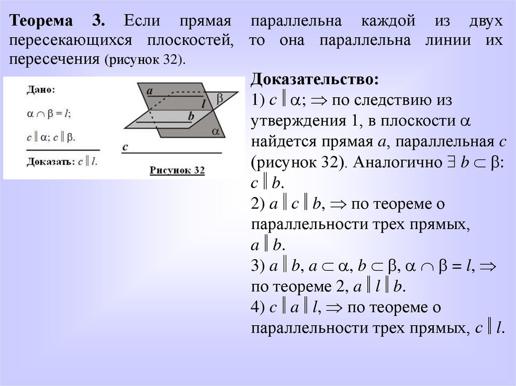 Теорема 3. Если прямая параллельна каждой из двухпересекающихся плоскостей, то она параллельна линии их