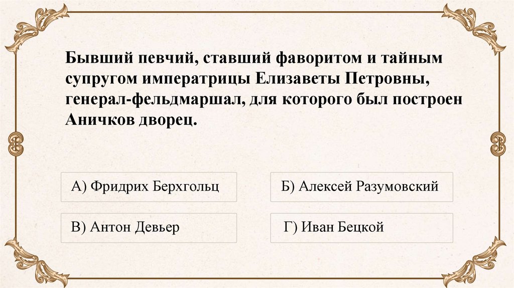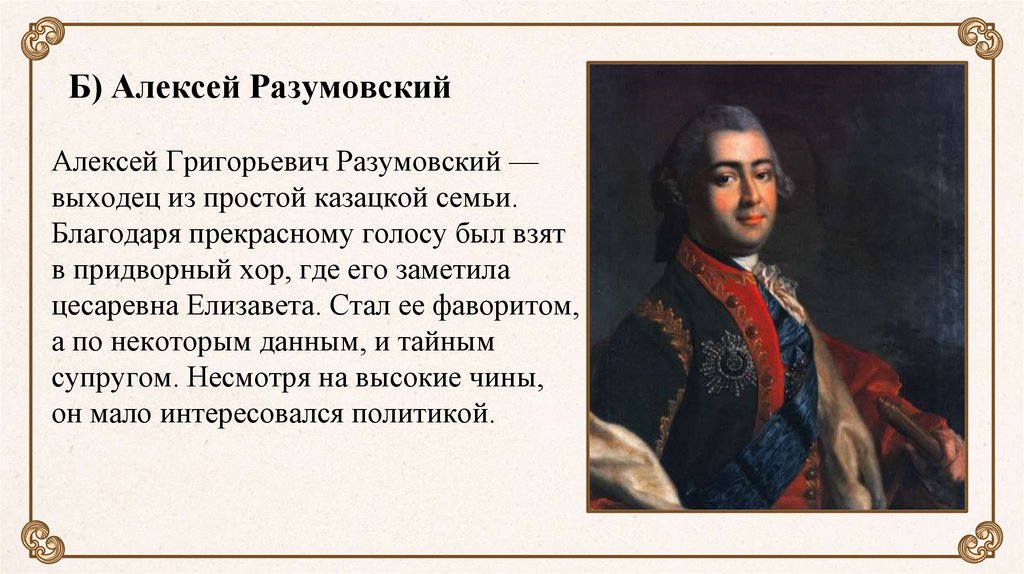 Б) Алексей РазумовскийАлексей Григорьевич Разумовский —