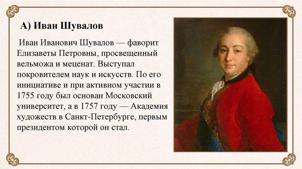 Фаворит Елизаветы Петровны, знаменитыймеценат, основатель Московского университета и