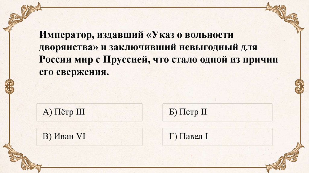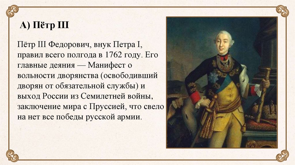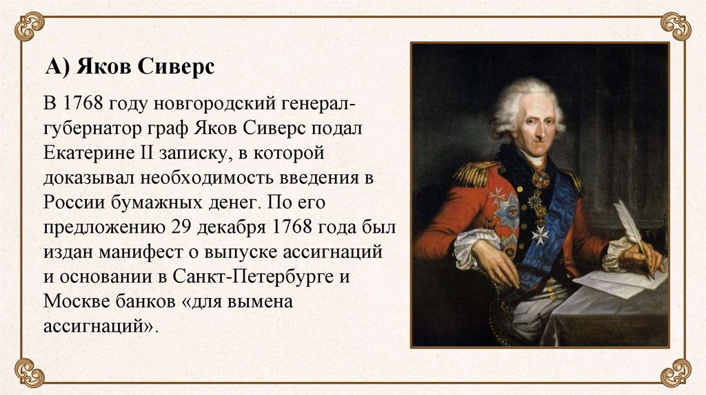 А) Яков СиверсВ 1768 году новгородский генералгубернатор граф Яков Сиверс подал