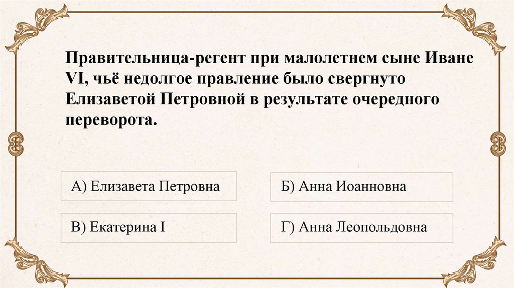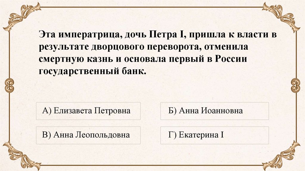 Эта императрица, дочь Петра I, пришла к власти врезультате дворцового переворота, отменила