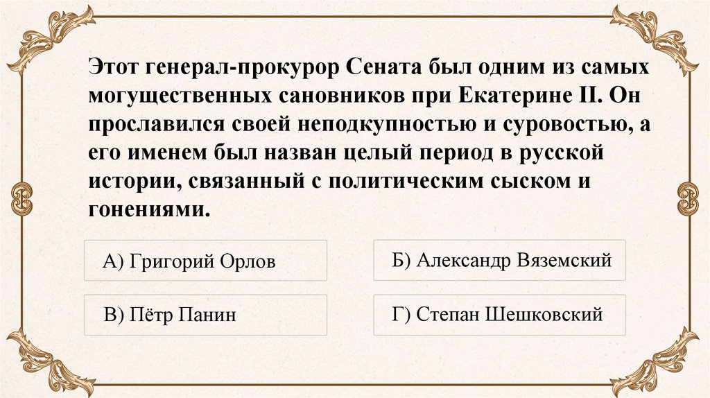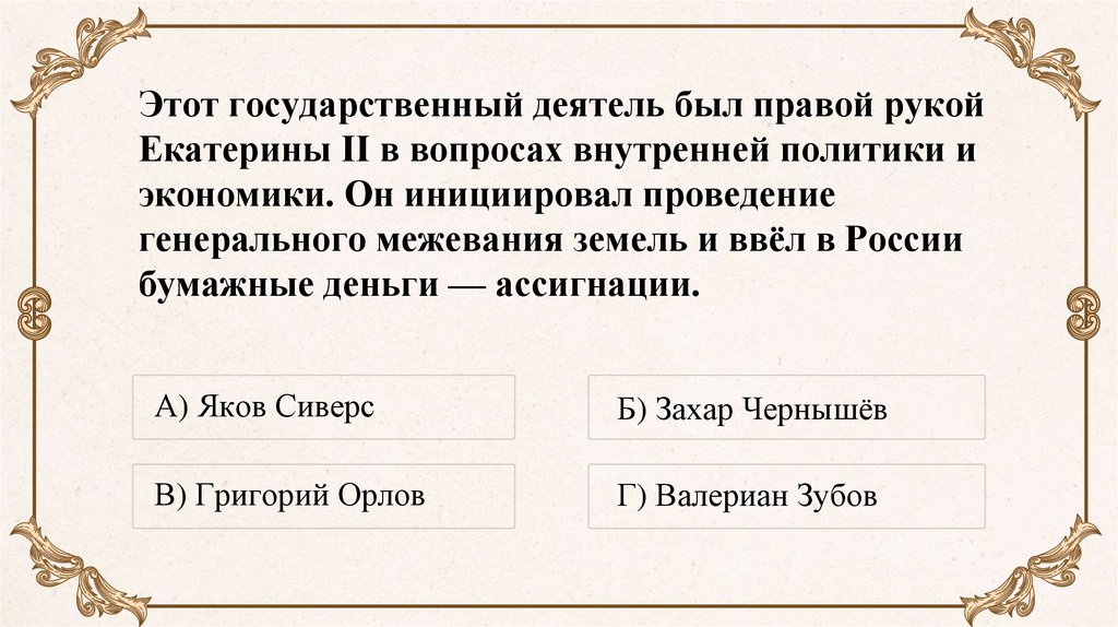 Этот государственный деятель был правой рукойЕкатерины II в вопросах внутренней политики и