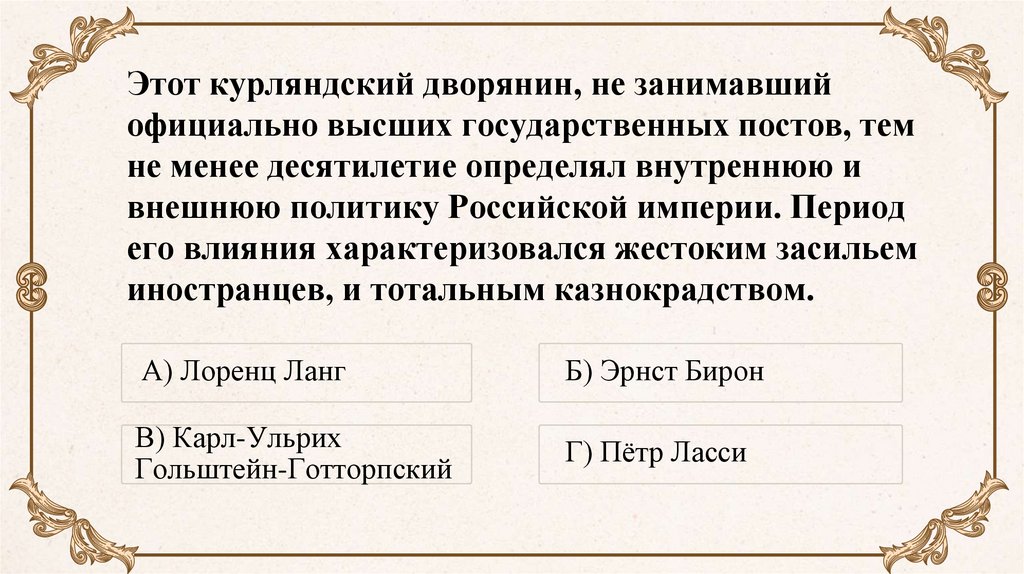 Этот курляндский дворянин, не занимавшийофициально высших государственных постов, тем