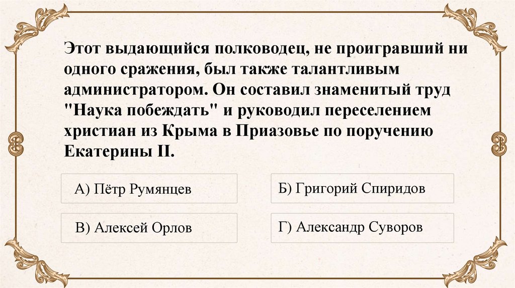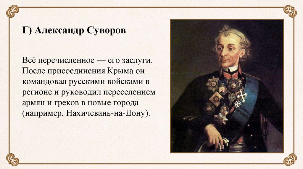 Г) Александр СуворовВсё перечисленное — его заслуги.