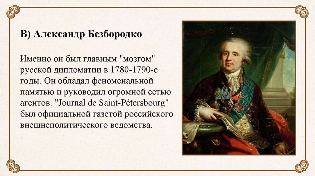 Кто возглавлял внешнеполитическое ведомствоРоссии в конце XVIII века, был главным