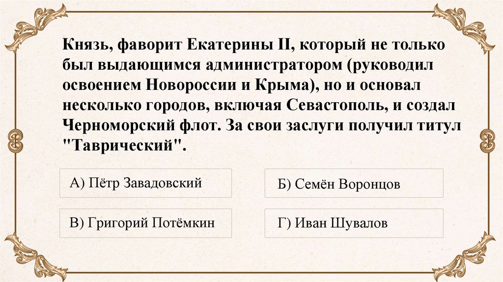 Князь, фаворит Екатерины II, который не толькобыл выдающимся администратором (руководил