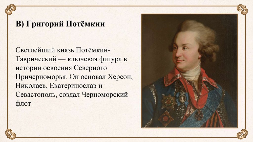 В) Григорий ПотёмкинСветлейший князь ПотёмкинТаврический — ключевая фигура в