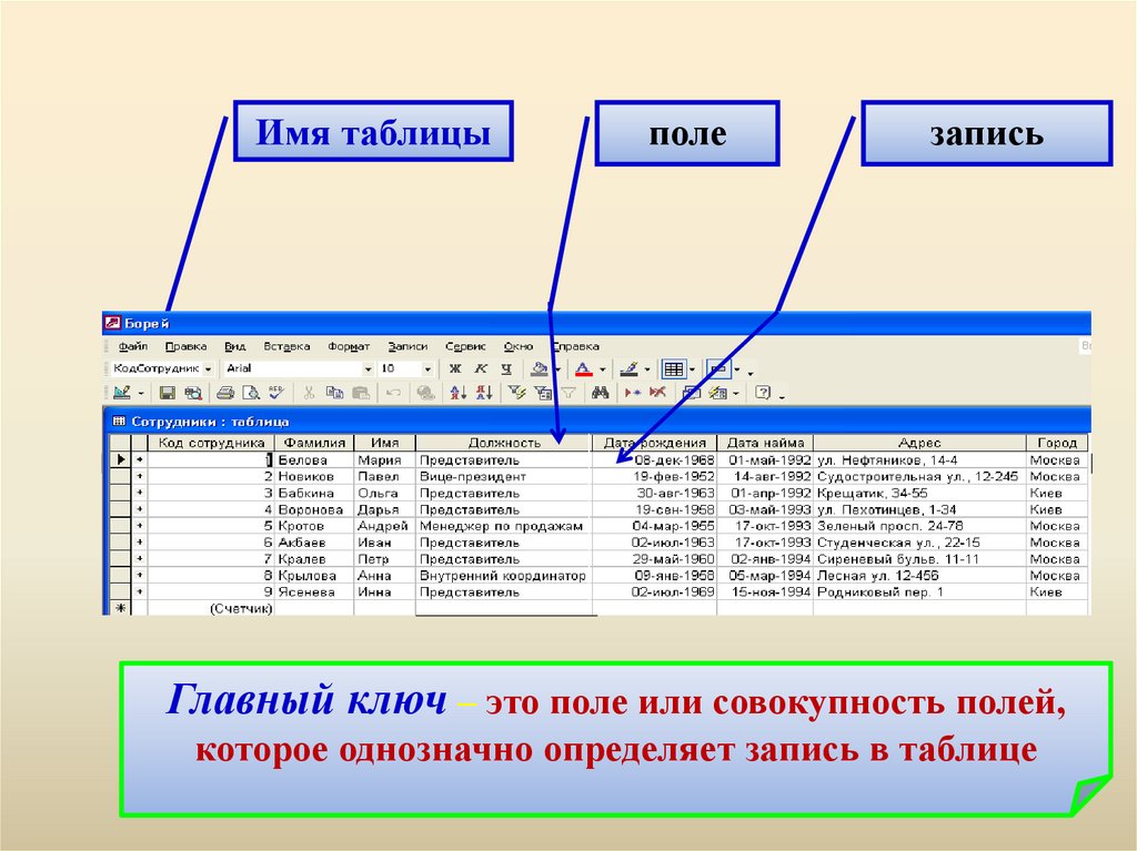 Основной элемент БД – таблицаКаждая таблица должна иметь своё имя.