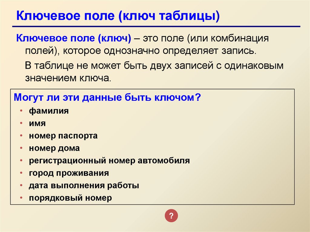 Ключевое поле (ключ таблицы)Ключевое поле (ключ) – это поле (или комбинация