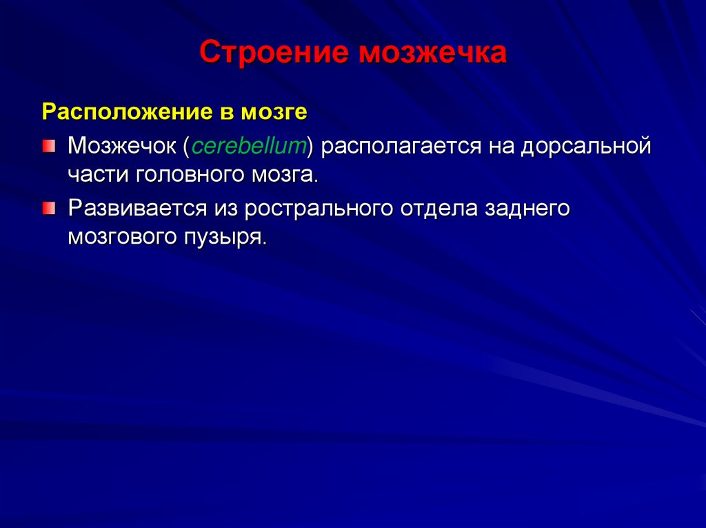 Расположение в мозгеМозжечок (cerebellum) располагается на дорсальной