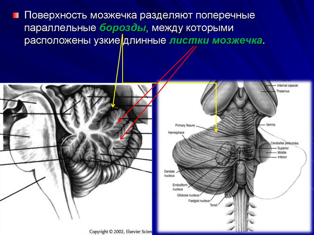 Поверхность мозжечка разделяют поперечныепараллельные борозды, между которыми