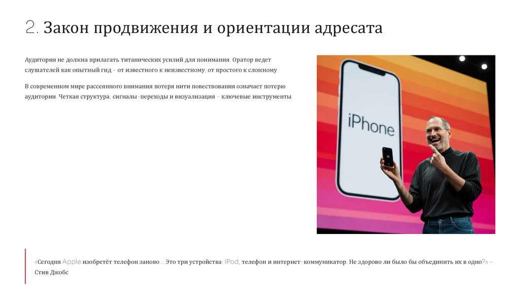 2. Закон продвижения и ориентации адресатаАудитория не должна прилагать титанических усилий для понимания. Оратор ведет