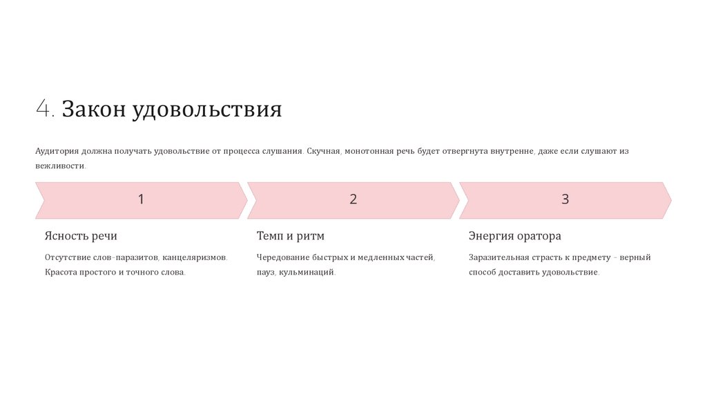 4. Закон удовольствияАудитория должна получать удовольствие от процесса слушания. Скучная, монотонная речь будет отвергнута внутренне, даже если слушают из