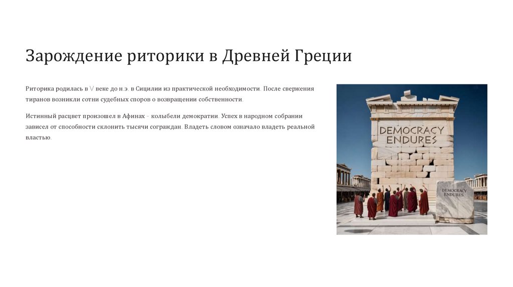Зарождение риторики в Древней ГрецииРиторика родилась в V веке до н.э. в Сицилии из практической необходимости. После свержения