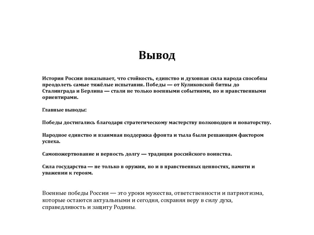 ВыводИстория России показывает, что стойкость, единство и духовная сила народа способны