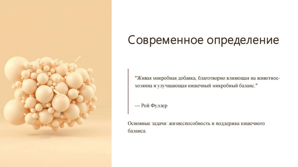 Современное определение"Живая микробная добавка, благотворно влияющая на животноехозяина и улучшающая кишечный микробный баланс."