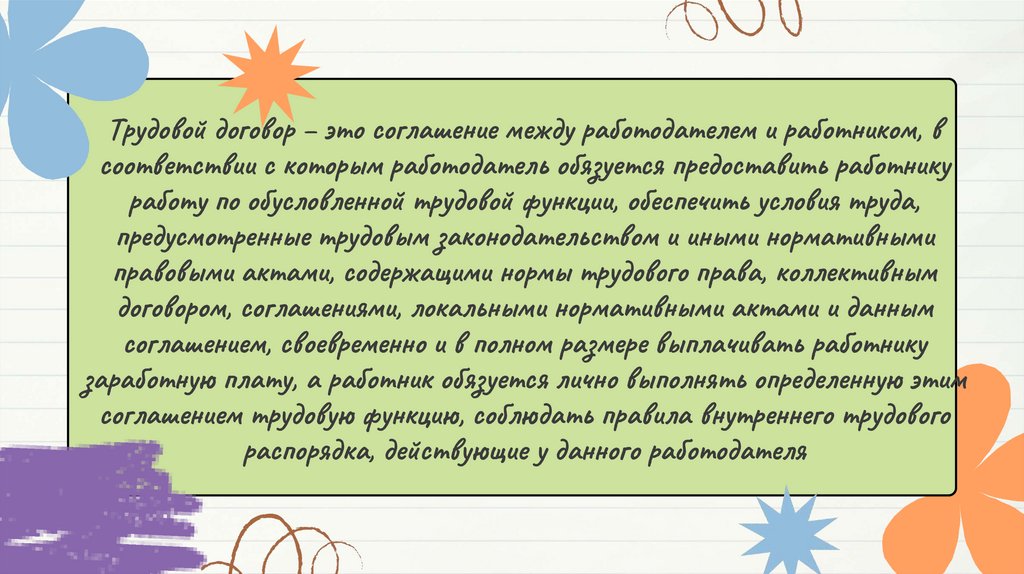Трудовой договор – это соглашение между работодателем и работником, всоответствии с которым работодатель обязуется предоставить работнику