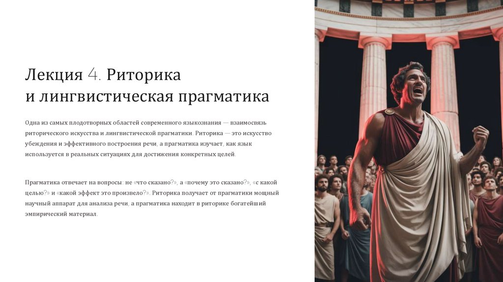 Оратор, строя речь, выстраивает цепь речевых актов для воздействия на аудиторию. Прагматика объясняет, почему риторические приемы работают.