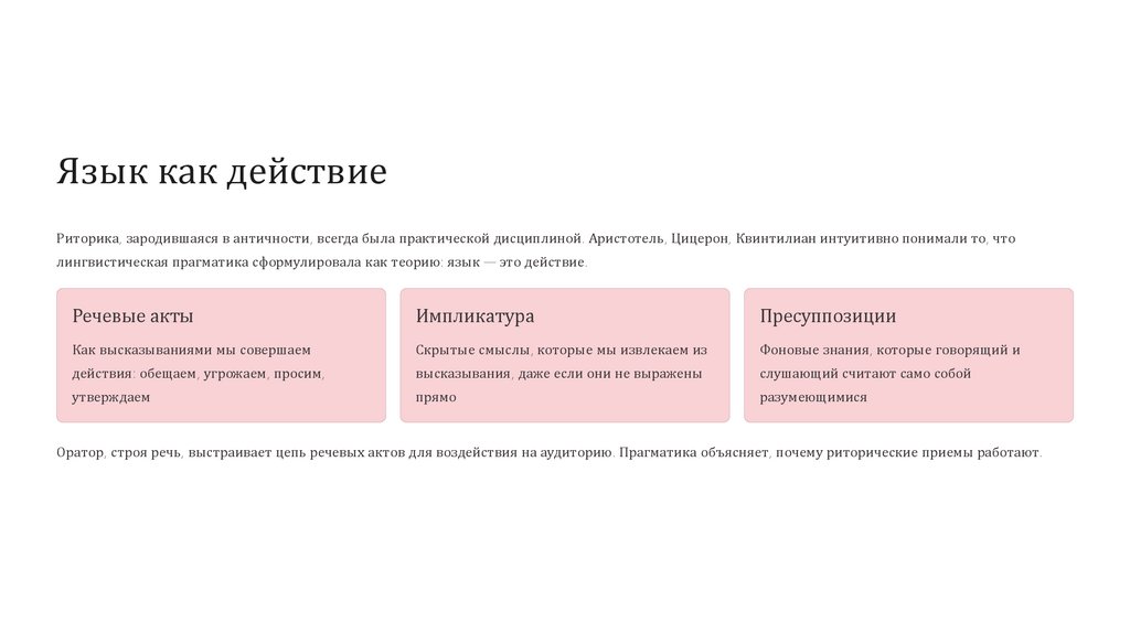 Язык как действиеРиторика, зародившаяся в античности, всегда была практической дисциплиной. Аристотель, Цицерон, Квинтилиан интуитивно понимали то, что