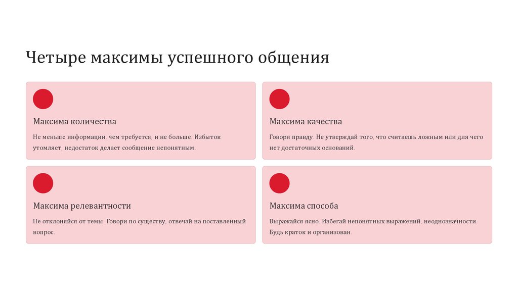 Этот принцип реализуется через соблюдение четырех максим, нарушение которых