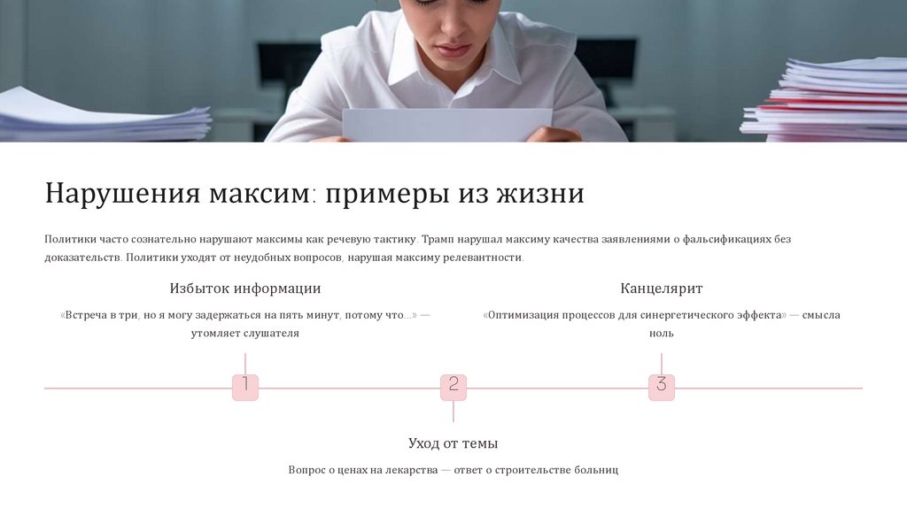 Нарушения максим: примеры из жизниПолитики часто сознательно нарушают максимы как речевую тактику. Трамп нарушал максиму качества заявлениями о фальсификациях без