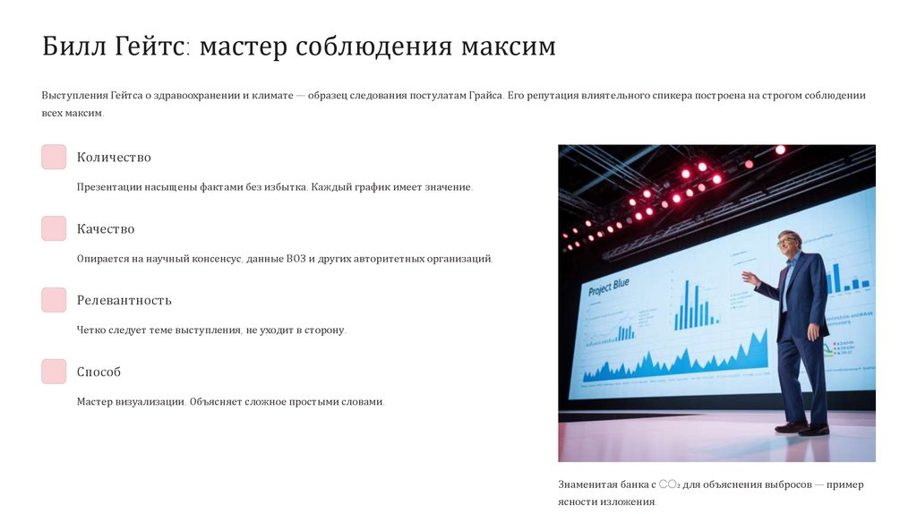 Билл Гейтс: мастер соблюдения максимВыступления Гейтса о здравоохранении и климате — образец следования постулатам Грайса. Его репутация влиятельного спикера построена на строгом соблюдении