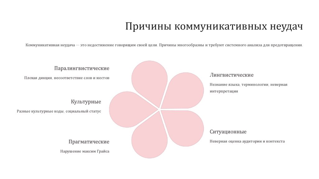 Причины коммуникативных неудачКоммуникативная неудача — это недостижение говорящим своей цели. Причины многообразны и требуют системного анализа для предотвращения.