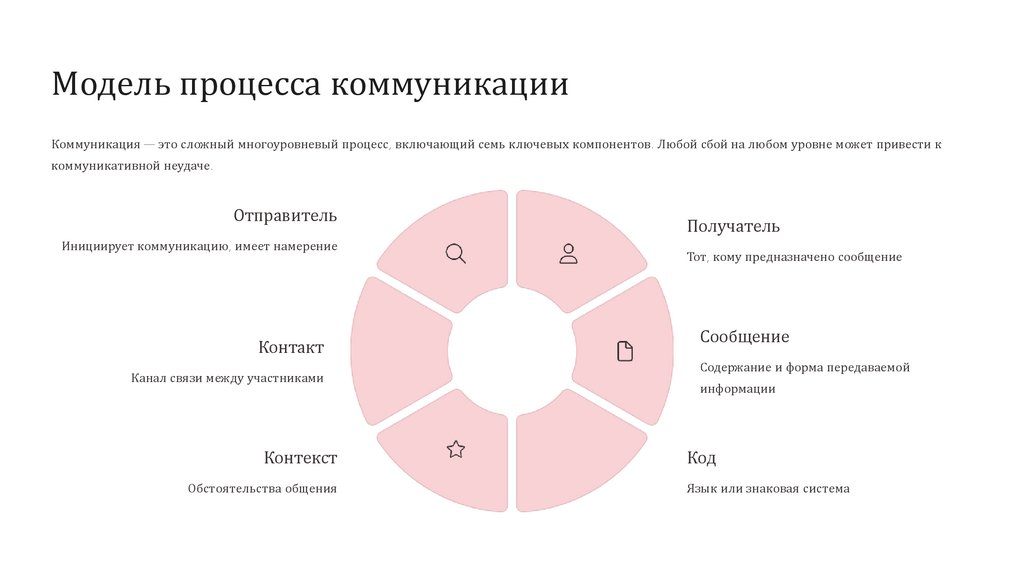 Модель процесса коммуникацииКоммуникация — это сложный многоуровневый процесс, включающий семь ключевых компонентов. Любой сбой на любом уровне может привести к
