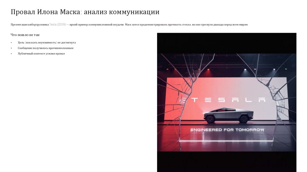 Провал Илона Маска: анализ коммуникацииПрезентация кибергрузовика Tesla (2019) — яркий пример коммуникативной неудачи. Маск хотел продемонстрировать прочность стекла, но оно треснуло дважды перед всем миром.