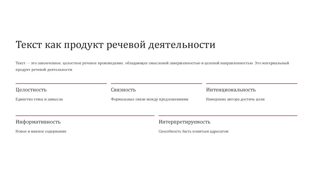 Текст как продукт речевой деятельностиТекст — это законченное, целостное речевое произведение, обладающее смысловой завершенностью и целевой направленностью. Это материальный