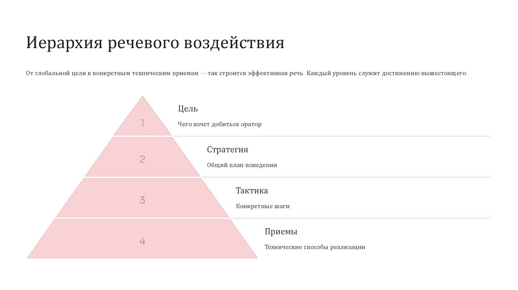 Иерархия речевого воздействияОт глобальной цели к конкретным техническим приемам — так строится эффективная речь. Каждый уровень служит достижению вышестоящего.