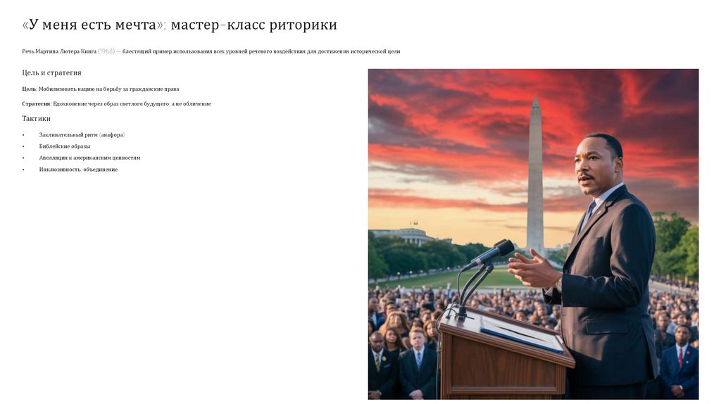 «У меня есть мечта»: мастер-класс риторикиРечь Мартина Лютера Кинга (1963) — блестящий пример использования всех уровней речевого воздействия для достижения исторической цели.