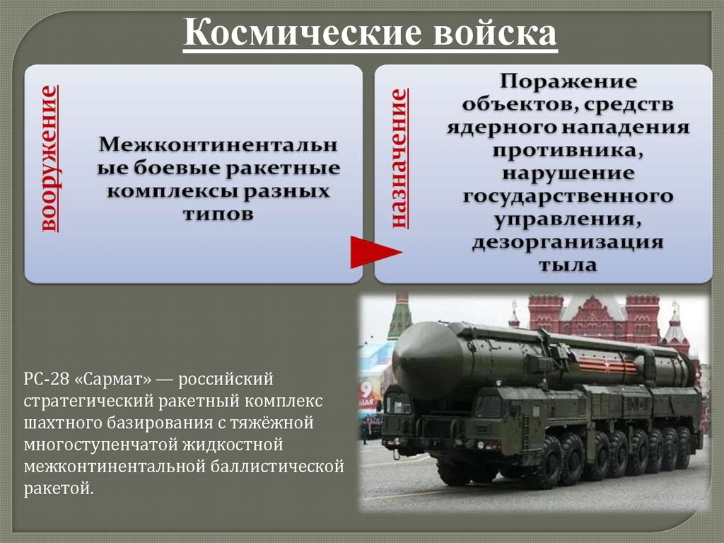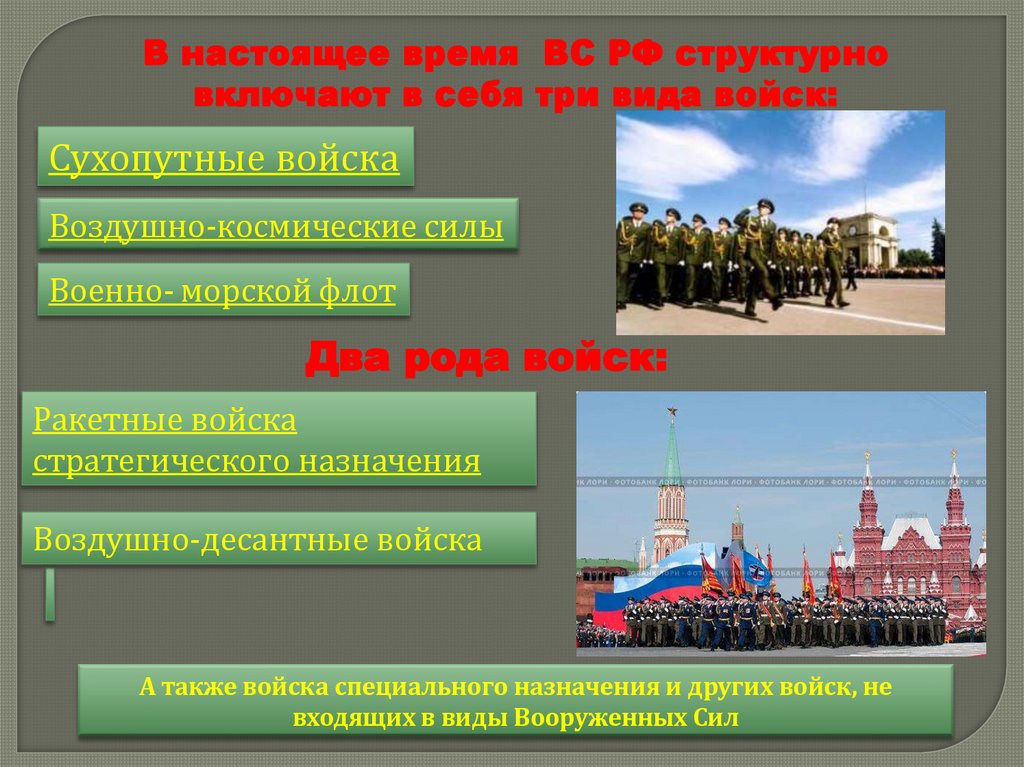 В настоящее время ВС РФ структурновключают в себя три вида войск: