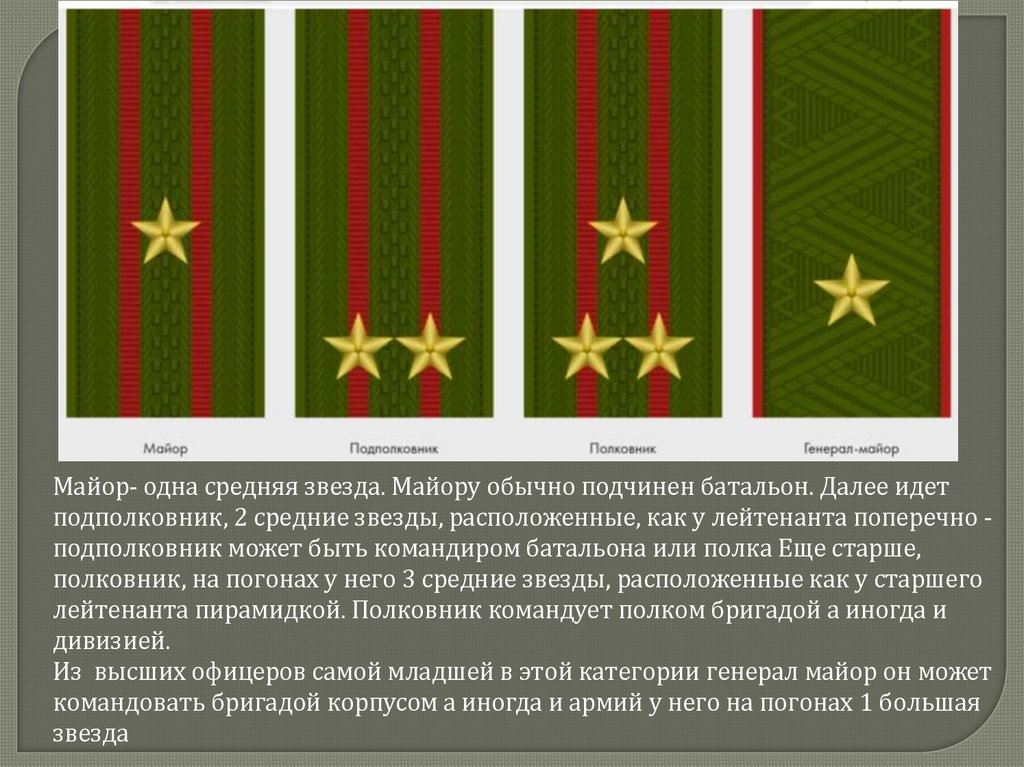 Майор- одна средняя звезда. Майору обычно подчинен батальон. Далее идетподполковник, 2 средние звезды, расположенные, как у лейтенанта поперечно подполковник может быть командиром батальона или полка Еще старше,