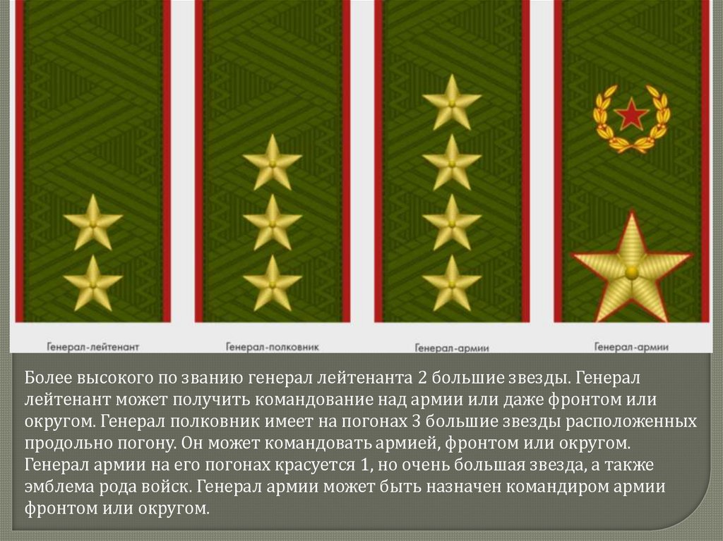 Более высокого по званию генерал лейтенанта 2 большие звезды. Генераллейтенант может получить командование над армии или даже фронтом или