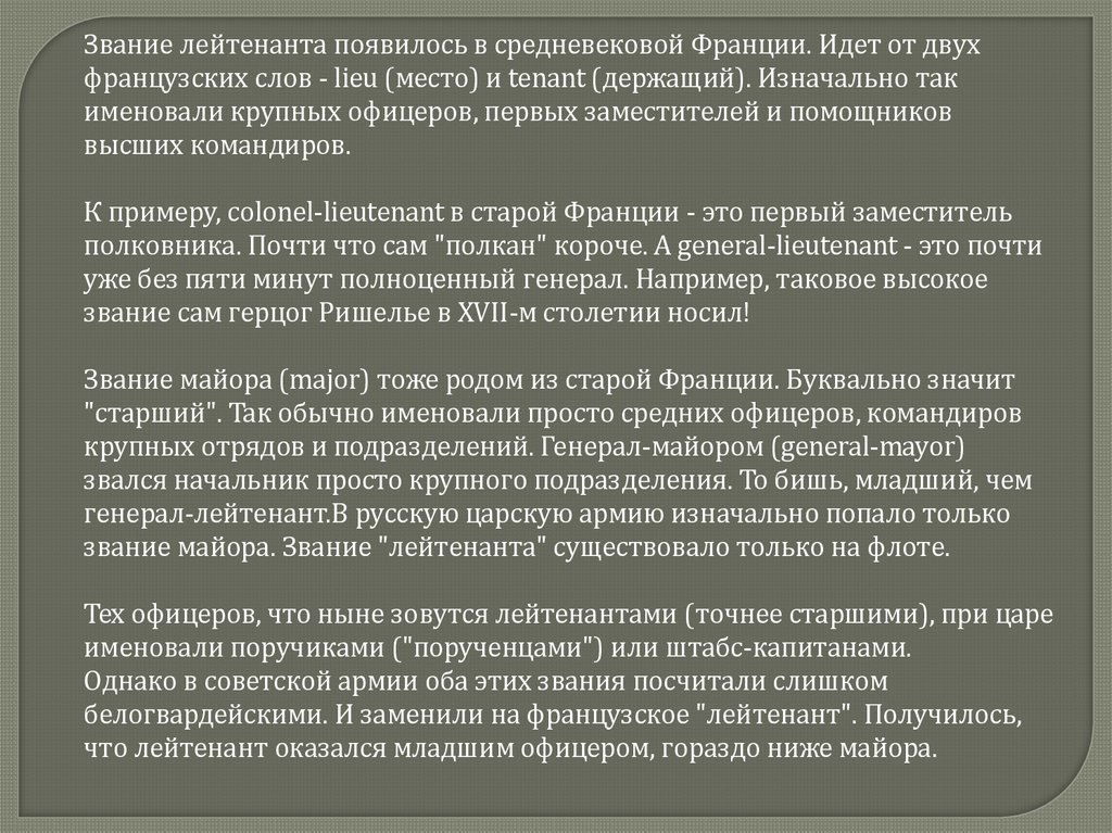 Звание майора (major) тоже родом из старой Франции. Буквально значит