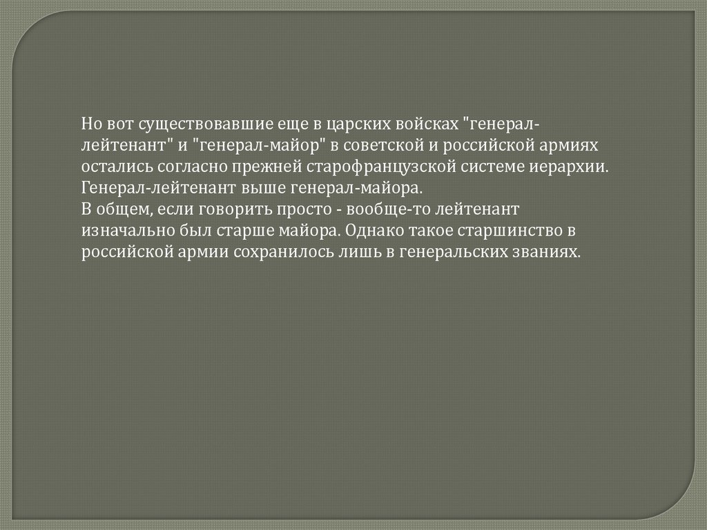 Но вот существовавшие еще в царских войсках "генераллейтенант" и "генерал-майор" в советской и российской армияхостались согласно прежней старофранцузской системе иерархии.