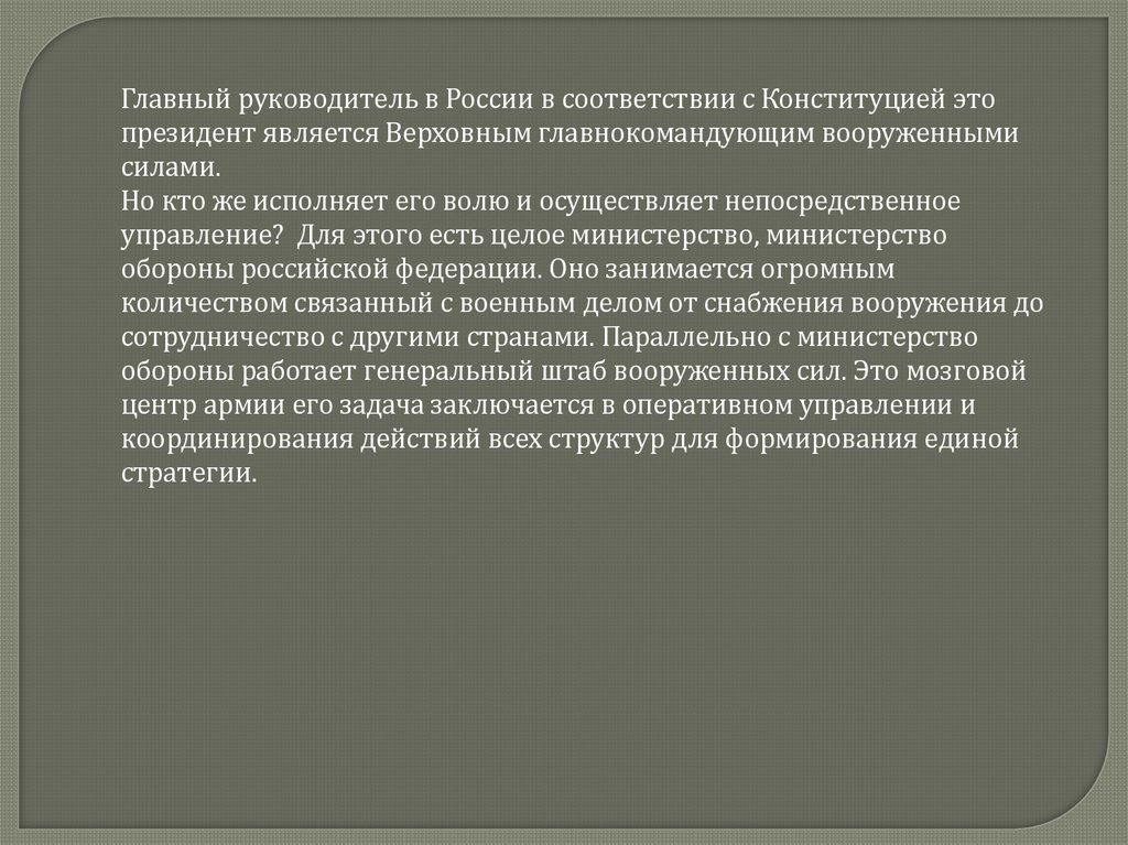 Главный руководитель в России в соответствии с Конституцией этопрезидент является Верховным главнокомандующим вооруженными
