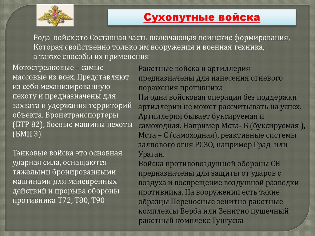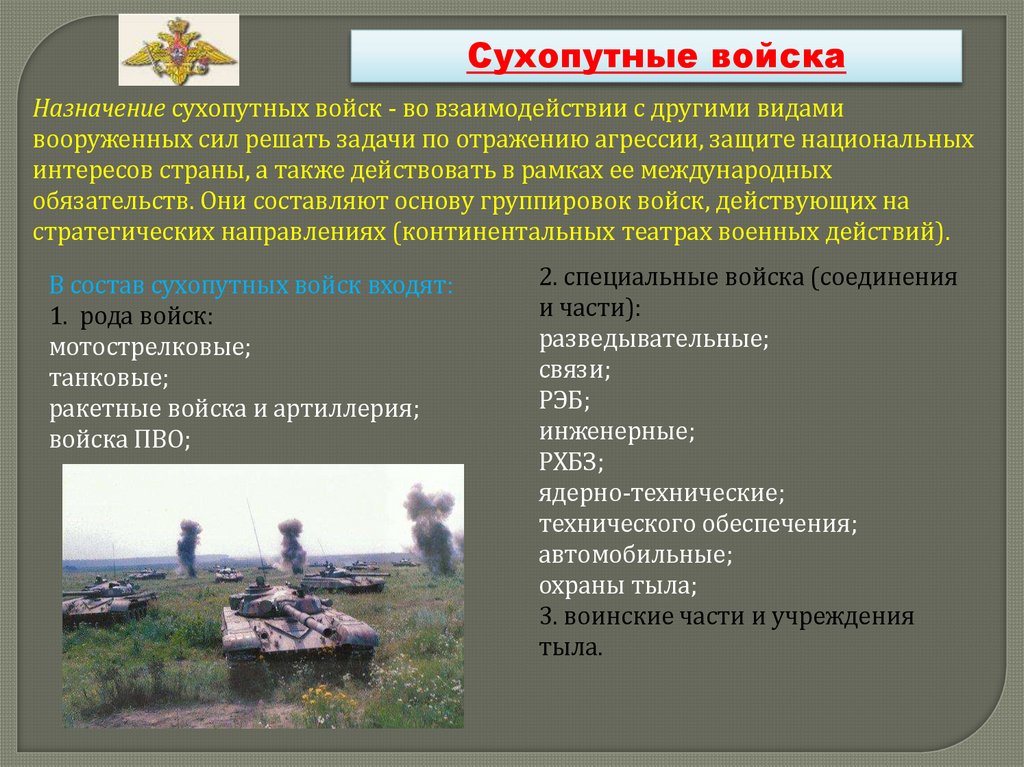 Сухопутные войскаНазначение сухопутных войск - во взаимодействии с другими видами