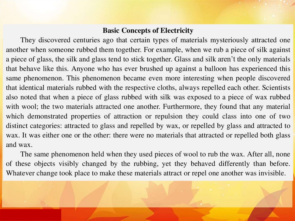 Basic Concepts of ElectricityThey discovered centuries ago that certain types of materials mysteriously attracted one