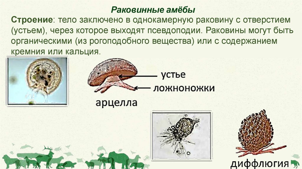 Раковинные амёбыСтроение: тело заключено в однокамерную раковину с отверстием
