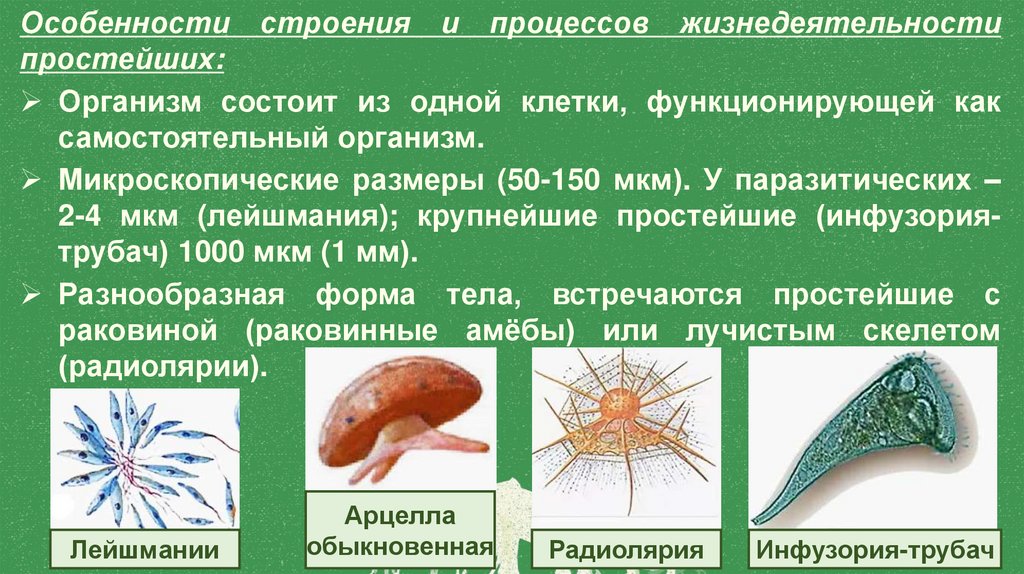 2-4 мкм (лейшмания); крупнейшие простейшие (инфузориятрубач) 1000 мкм (1 мм).