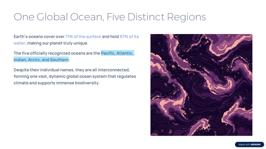 One Global Ocean, Five Distinct RegionsEarth’s oceans cover over 71% of the surface and hold 97% of its