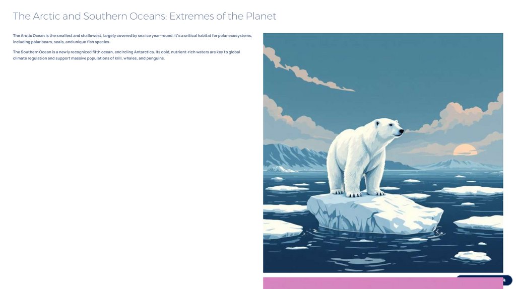 The Arctic and Southern Oceans: Extremes of the PlanetThe Arctic Ocean is the smallest and shallowest, largely covered by sea ice year-round. It's a critical habitat for polar ecosystems,