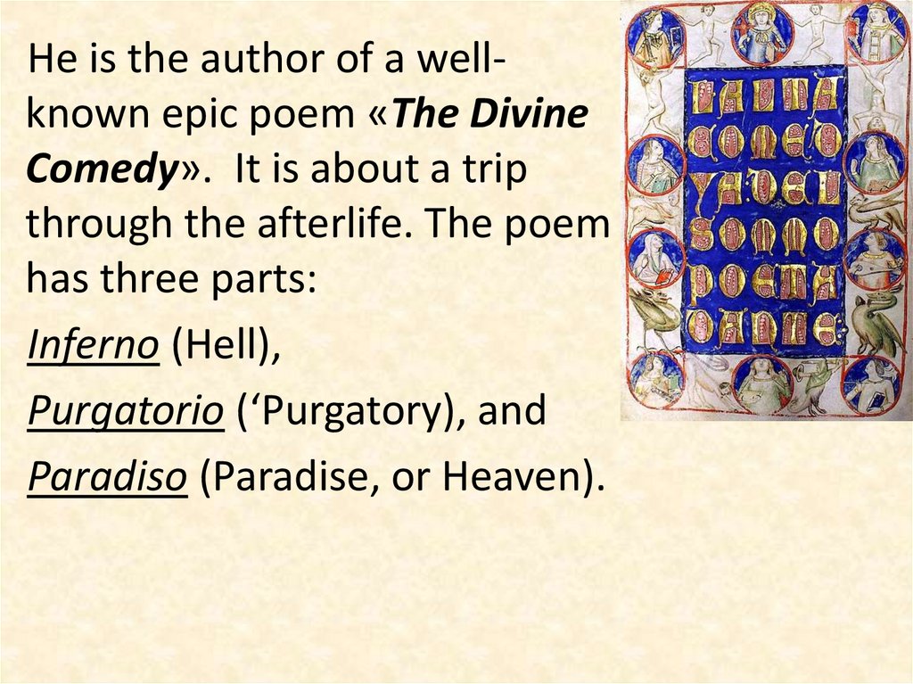 He is the author of a wellknown epic poem «The DivineComedy». It is about a trip