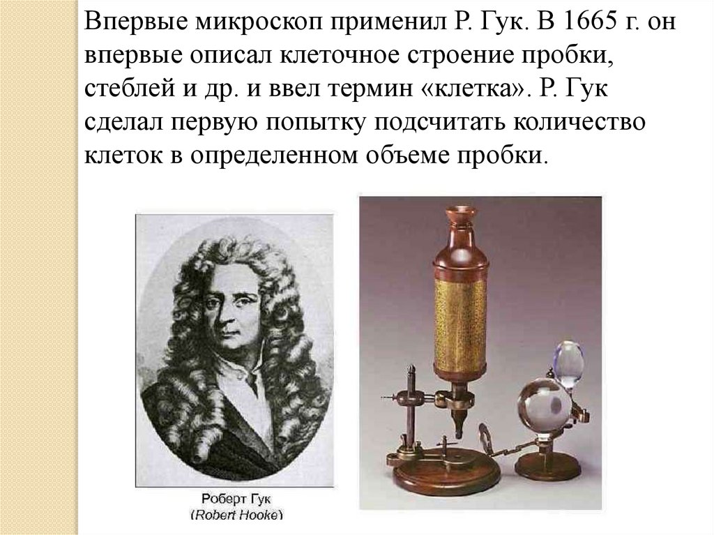 Впервые микроскоп применил Р. Гук. В 1665 г. онвпервые описал клеточное строение пробки,