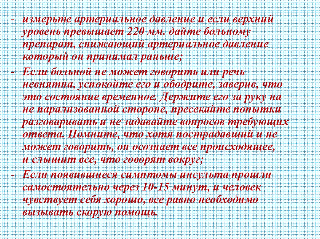 - измерьте артериальное давление и если верхнийуровень превышает 220 мм. дайте больному
