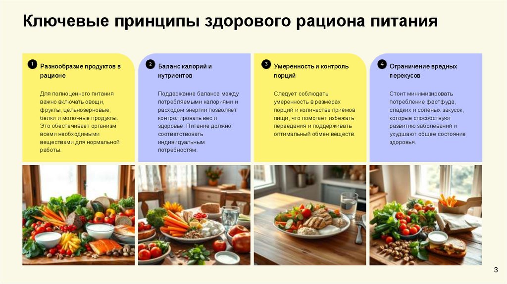 Ключевые принципы здорового рациона питанияРазнообразие продуктов в