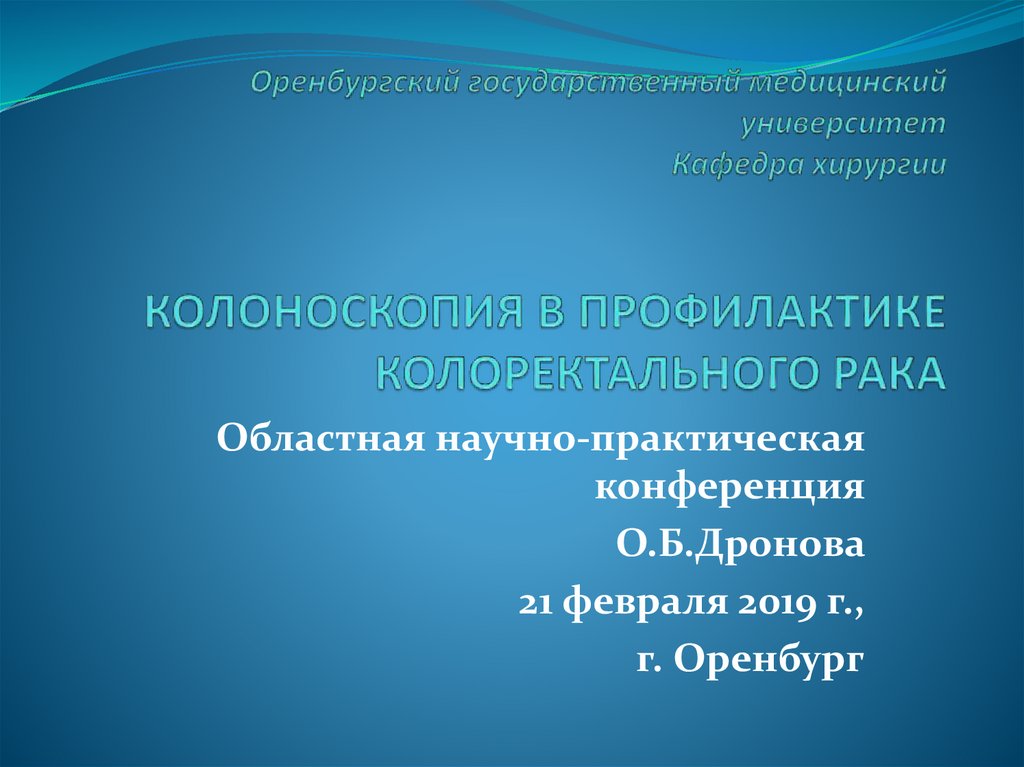 1. Оренбургский государственный медицинский университет Кафедра хирургии КОЛОНОСКОПИЯ В ПРОФИЛАКТИКЕ КОЛОРЕКТАЛЬНОГО РАКА