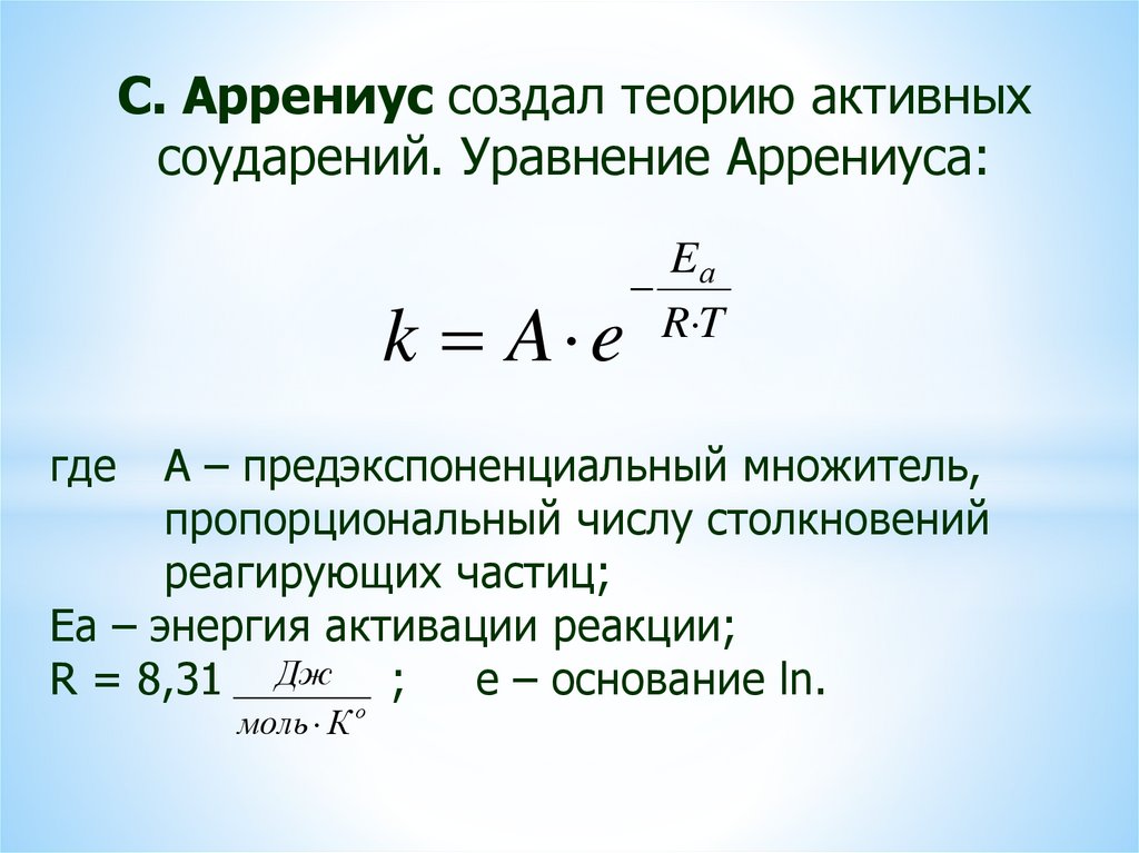 С. Аррениус создал теорию активныхсоударений. Уравнение Аррениуса: